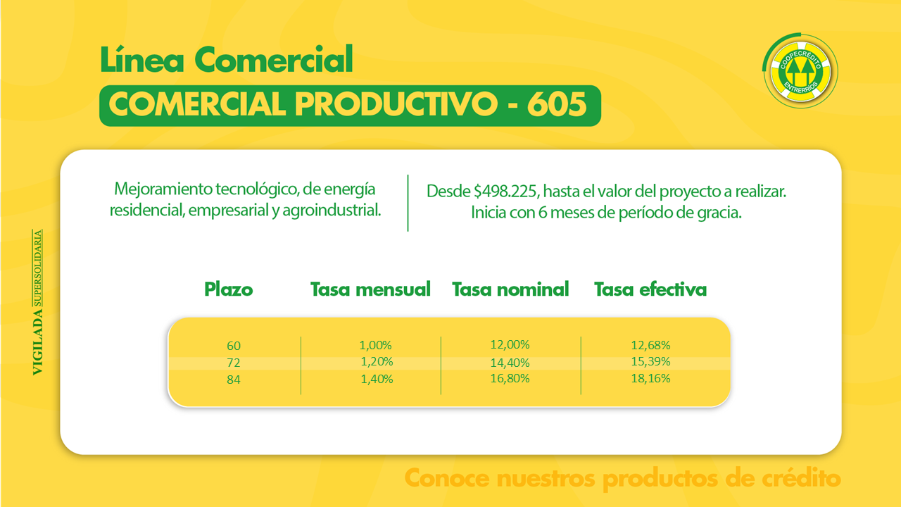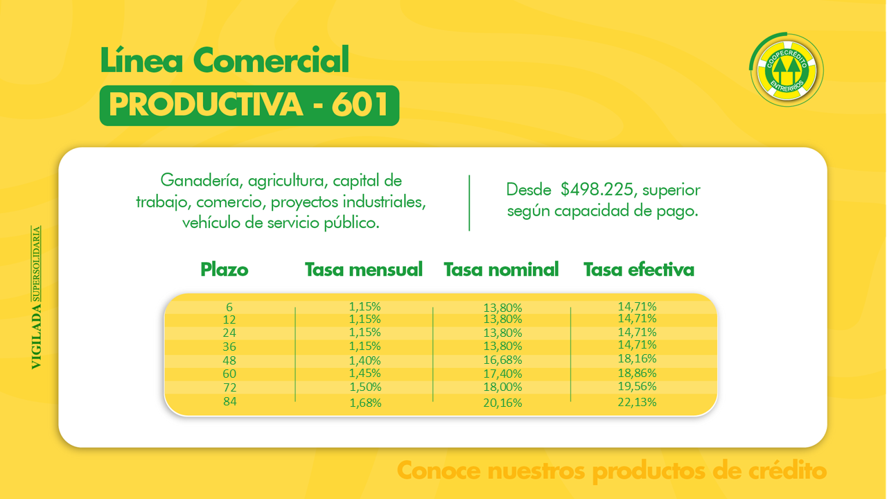 El crédito productivo está dirigido a proporcionar capital de trabajo y/o financiar la adquisición, ampliación y/o montaje de maquinaria y equipo, vehículos y bienes inmuebles para el desarrollo de actividades económicas organizadas. Igualmente, para financiar la adquisición de semovientes e insumos requeridos para el desarrollo de actividades agrícolas y ganaderas.